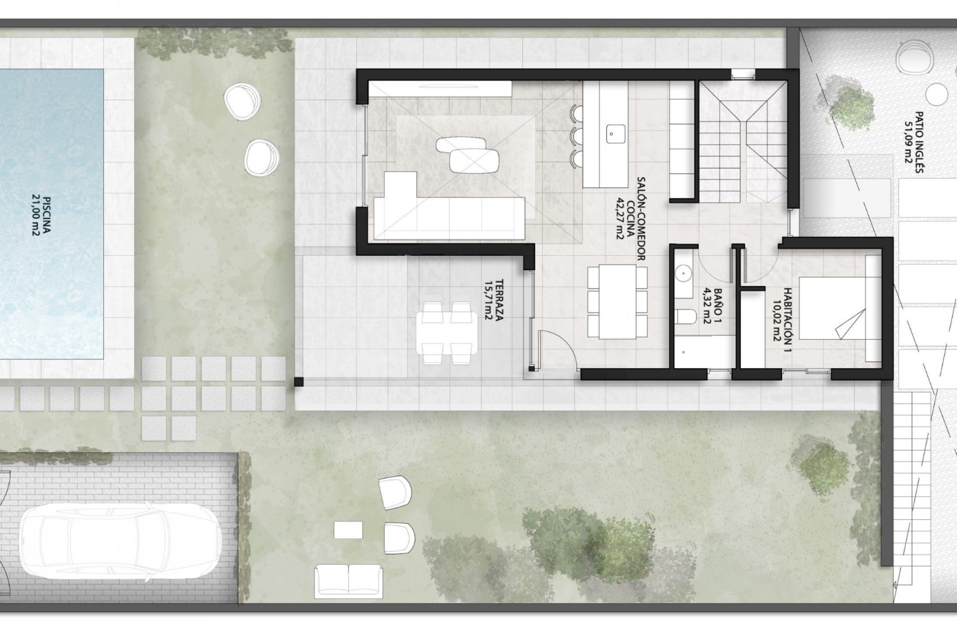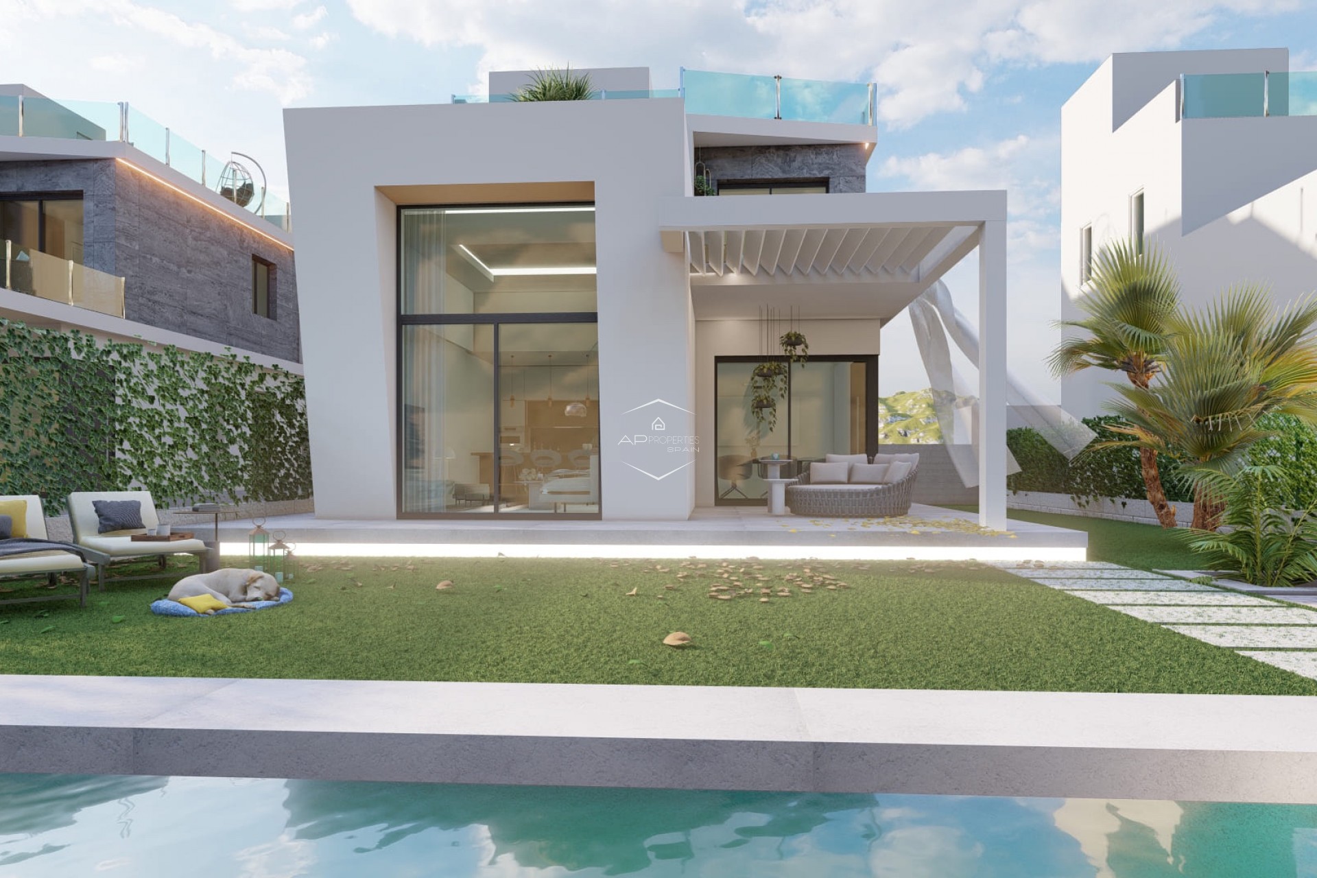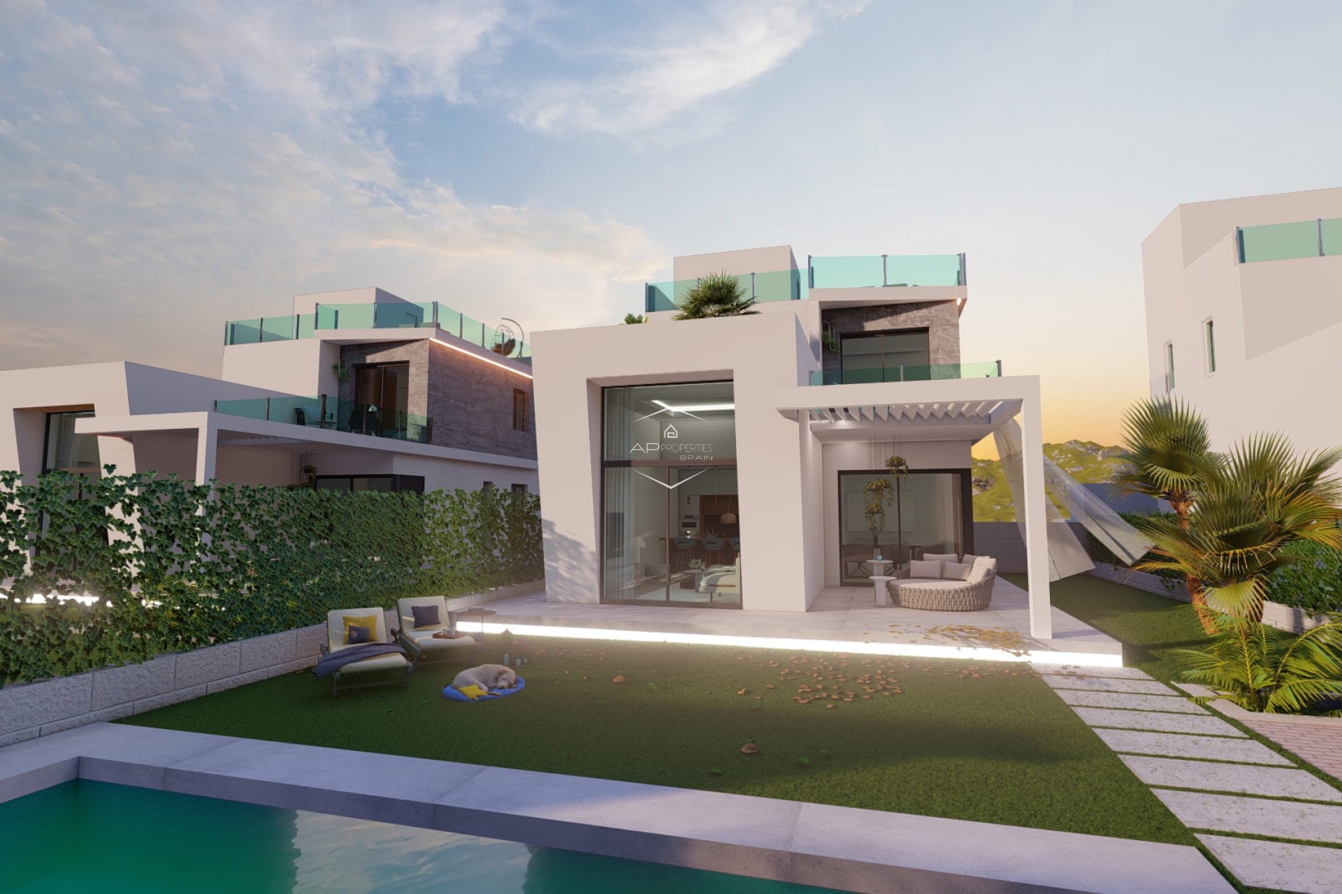 Toutes les maisons ont 3 grandes chambres, 3 salles de bains, une cuisine ouverte, un solarium, un espace extérieur avec piscine privée, l'air conditionné, des volets électriques, un éclairage LED,...