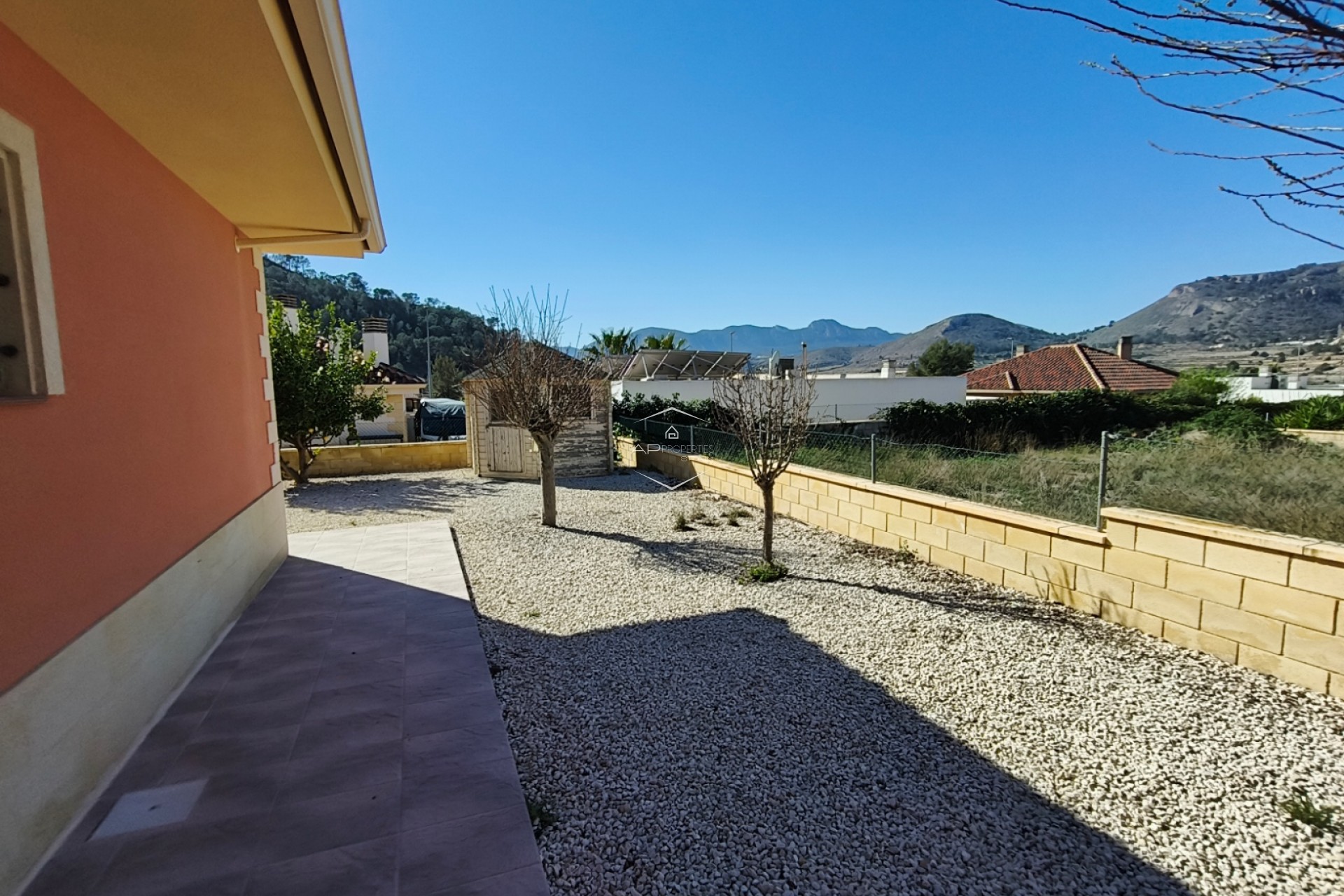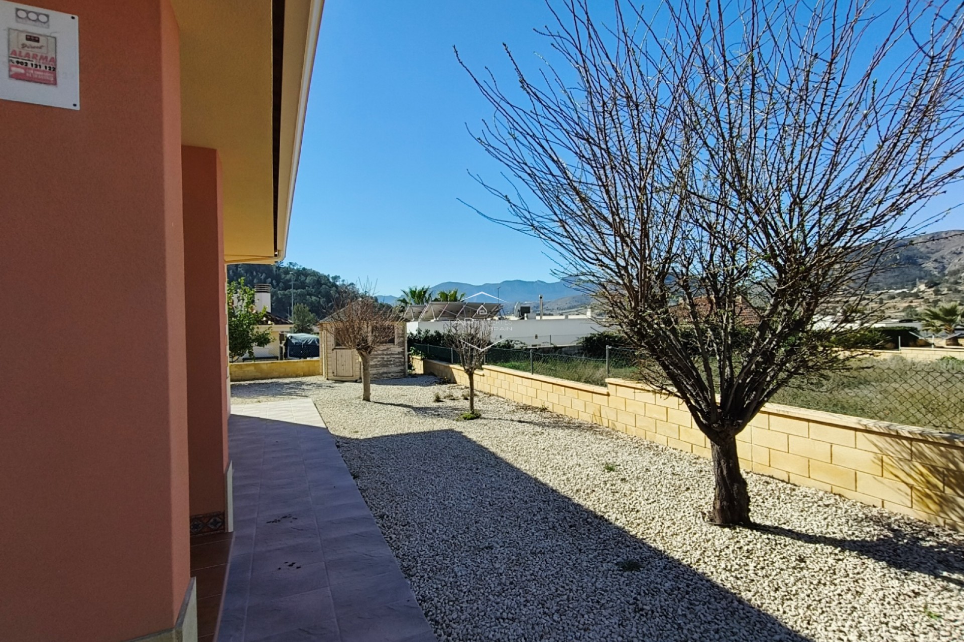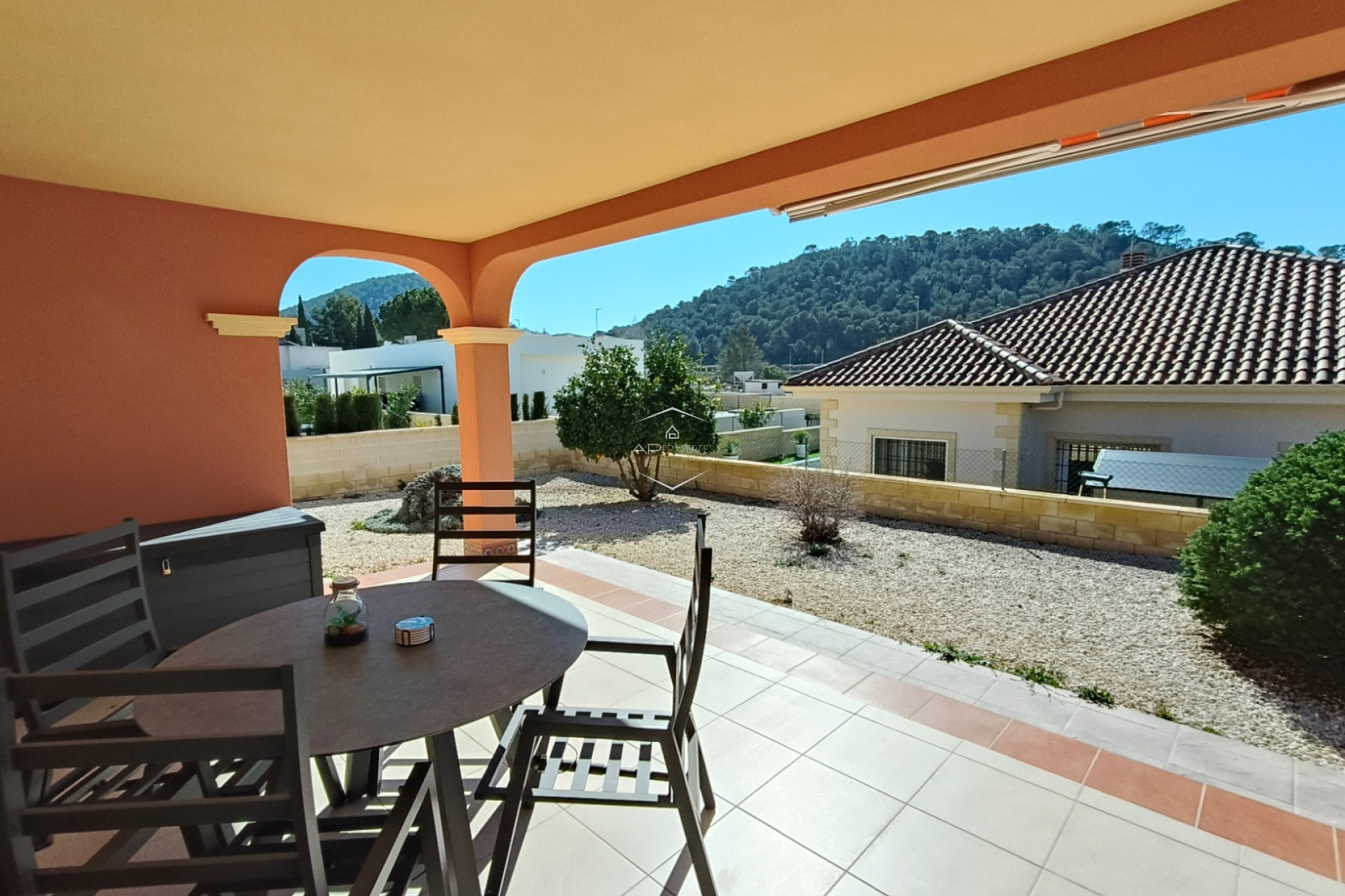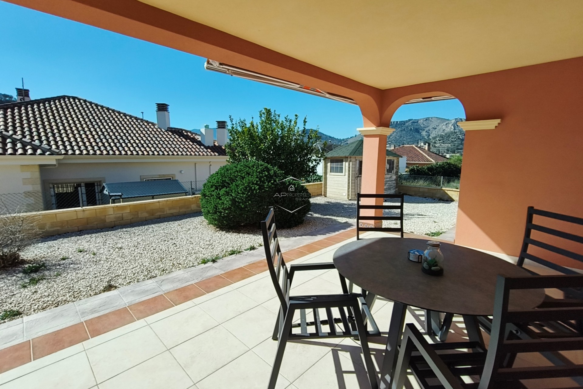 De overgang tussen binnen- en buitenleven is naadloos, met een overdekt terras van 24 m² dat de ideale plek biedt om buiten te dineren of simpelweg te genieten van het uitzicht op de bergen. De omliggende tuin is onderhoudsarm ontworpen, zodat u kunt genieten van de Spaanse zon zonder de last van zwaar onderhoud, en er is een praktisch tuinhuisje voor extra opbergruimte.