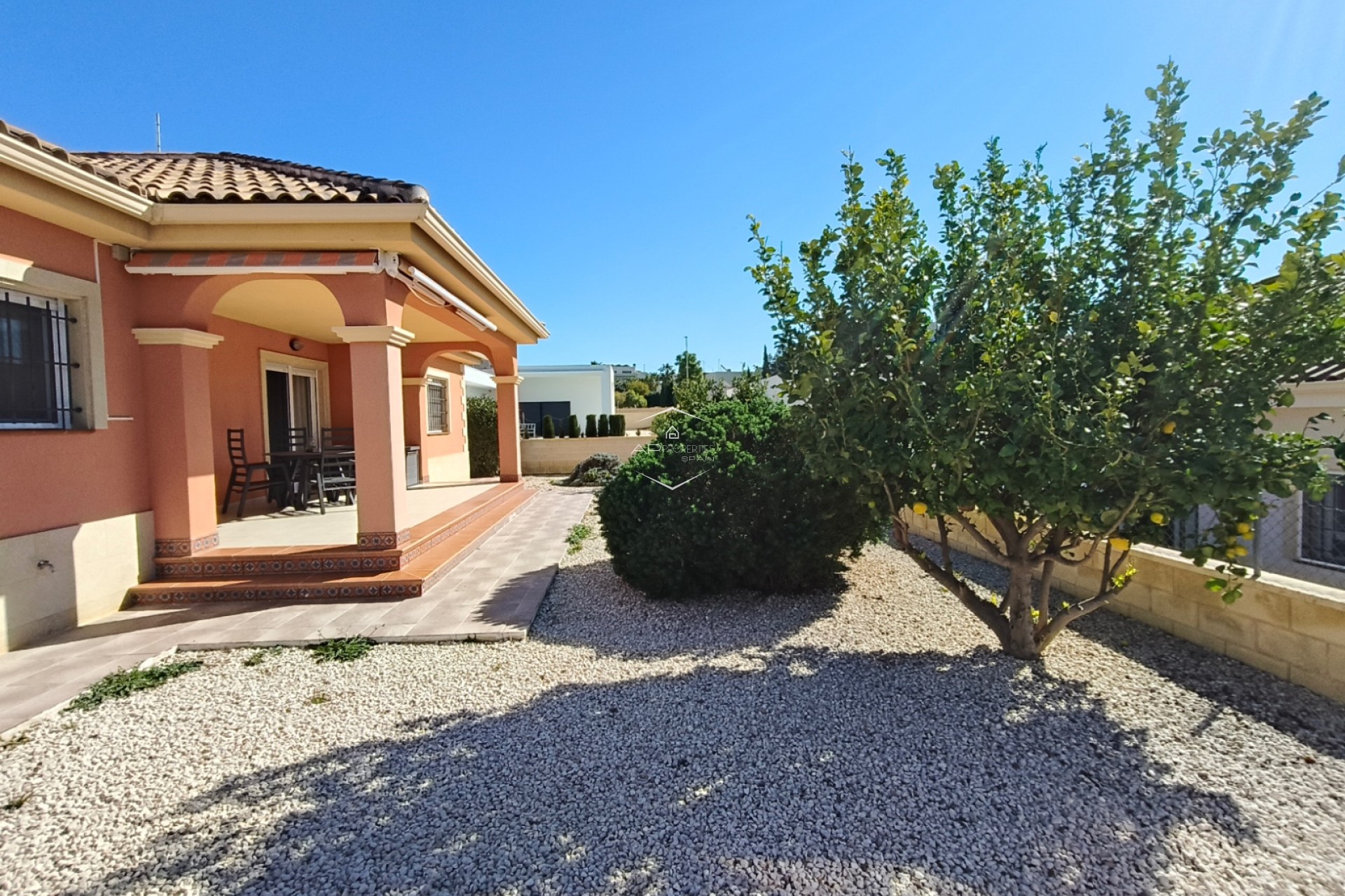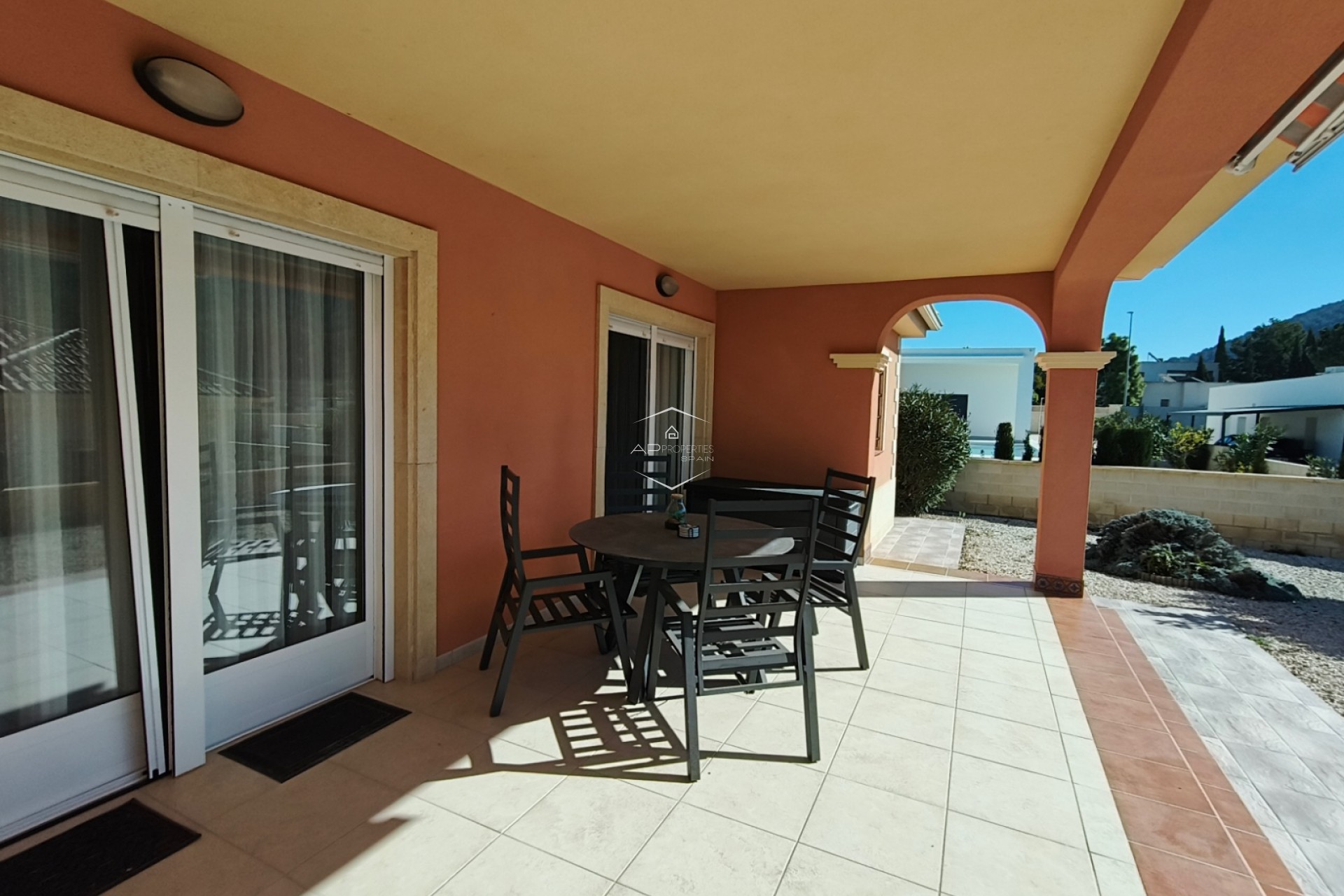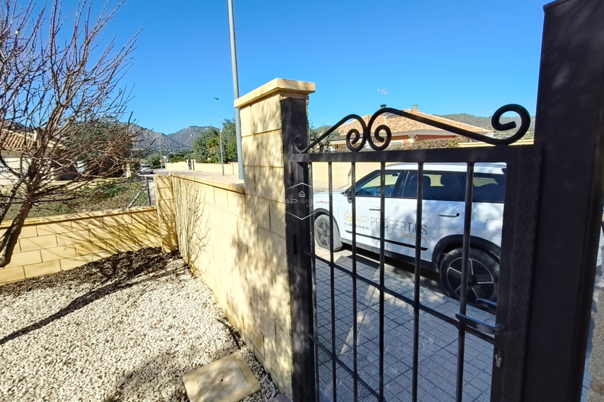 De overgang tussen binnen- en buitenleven is naadloos, met een overdekt terras van 24 m² dat de ideale plek biedt om buiten te dineren of simpelweg te genieten van het uitzicht op de bergen. De omliggende tuin is onderhoudsarm ontworpen, zodat u kunt genieten van de Spaanse zon zonder de last van zwaar onderhoud, en er is een praktisch tuinhuisje voor extra opbergruimte.