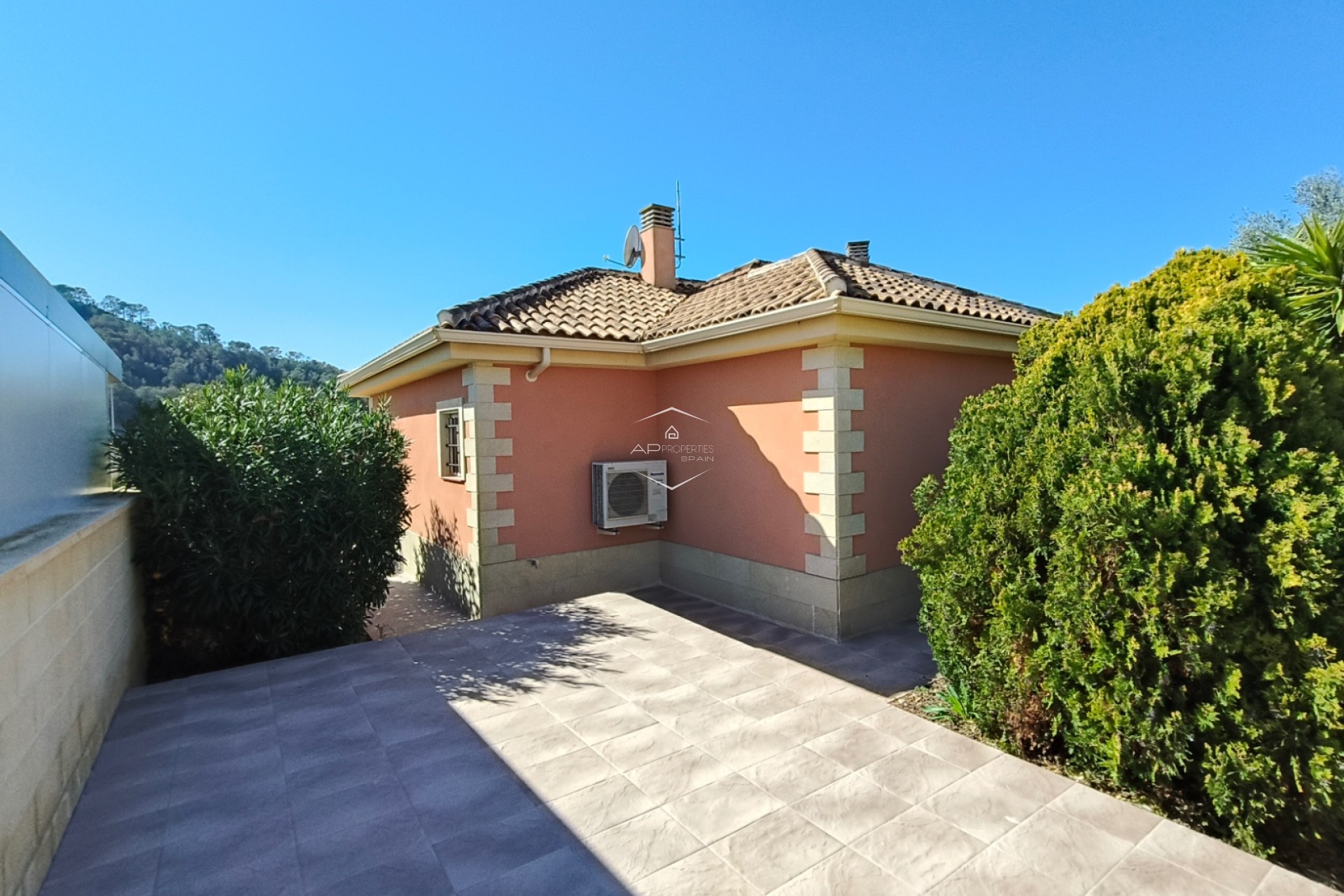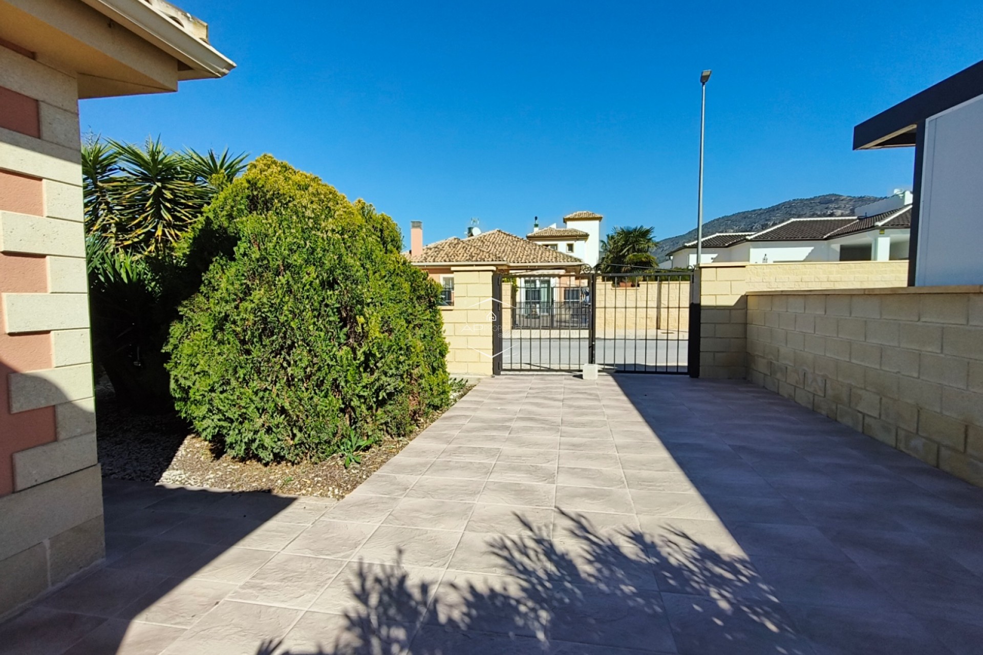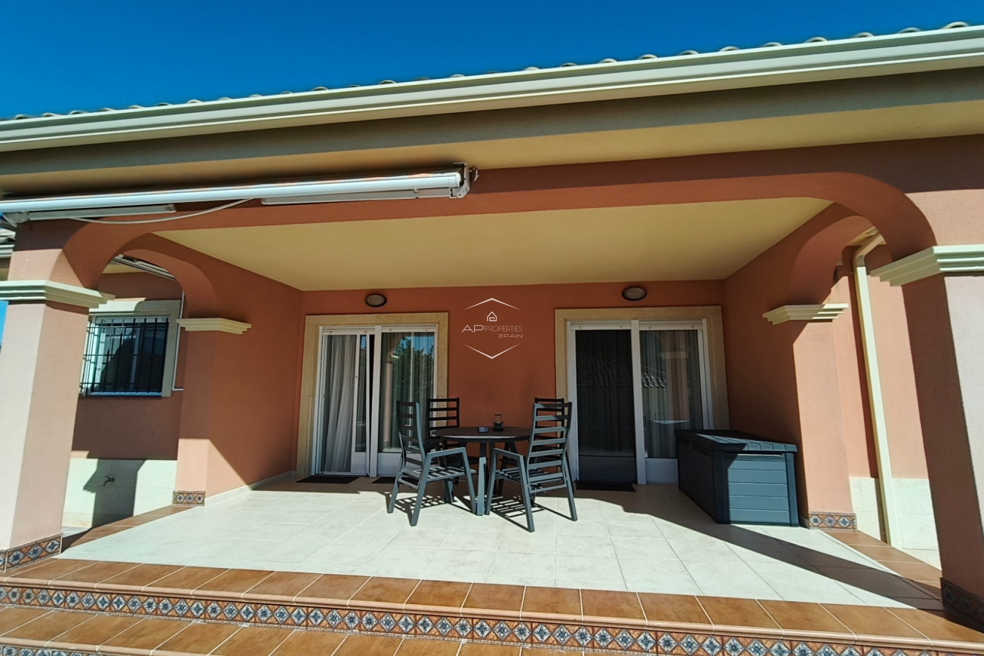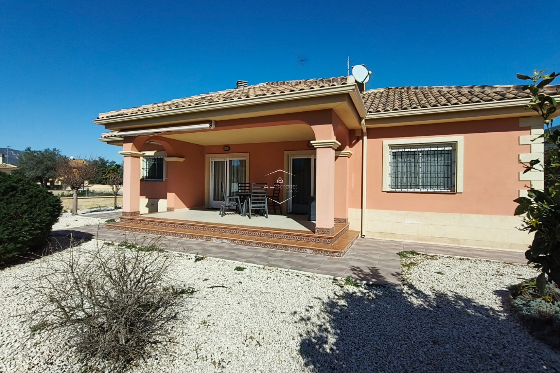 De overgang tussen binnen- en buitenleven is naadloos, met een overdekt terras van 24 m² dat de ideale plek biedt om buiten te dineren of simpelweg te genieten van het uitzicht op de bergen. De omliggende tuin is onderhoudsarm ontworpen, zodat u kunt genieten van de Spaanse zon zonder de last van zwaar onderhoud, en er is een praktisch tuinhuisje voor extra opbergruimte.
