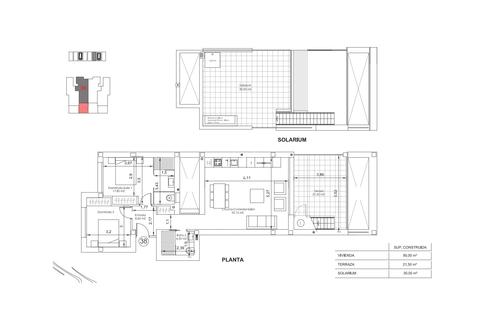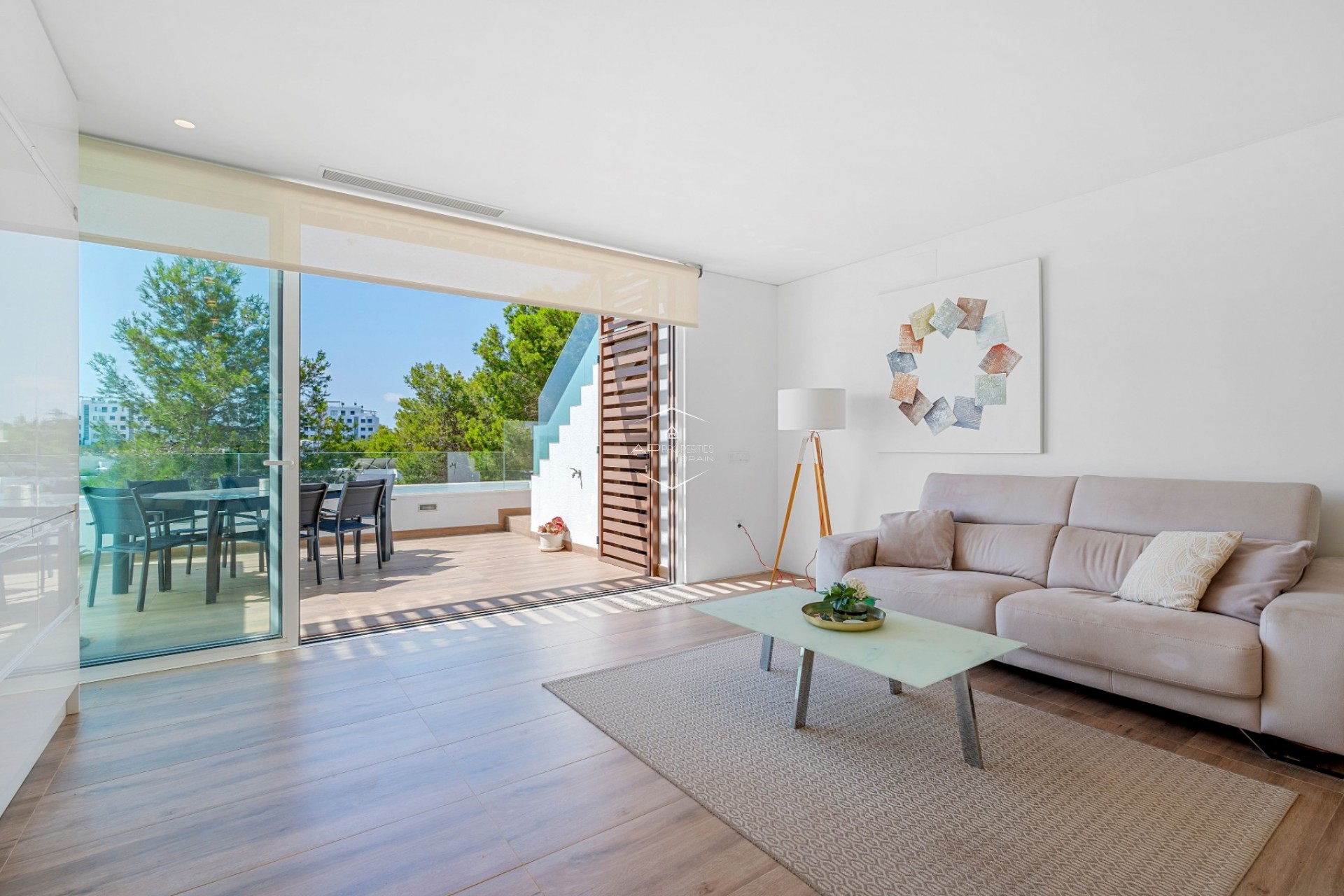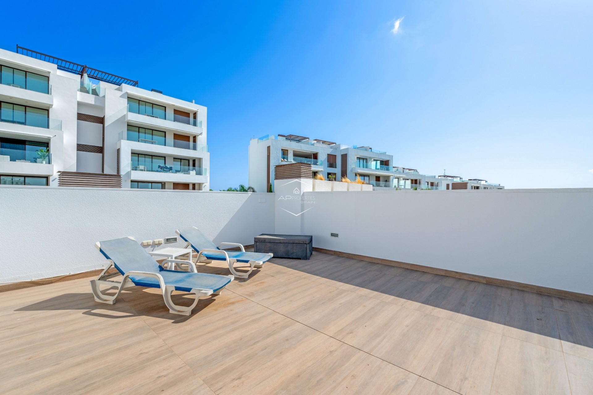 This spacious and elegant 2-bedroom penthouse apartment (a generous 90 m²!) was completed by renowned developer Somium in October 2016. It features a large south-facing terrace with open panoramic views over Las Colinas — the perfect spot to enjoy your morning coffee in the sun. From the terrace, you can also access a private rooftop solarium.
