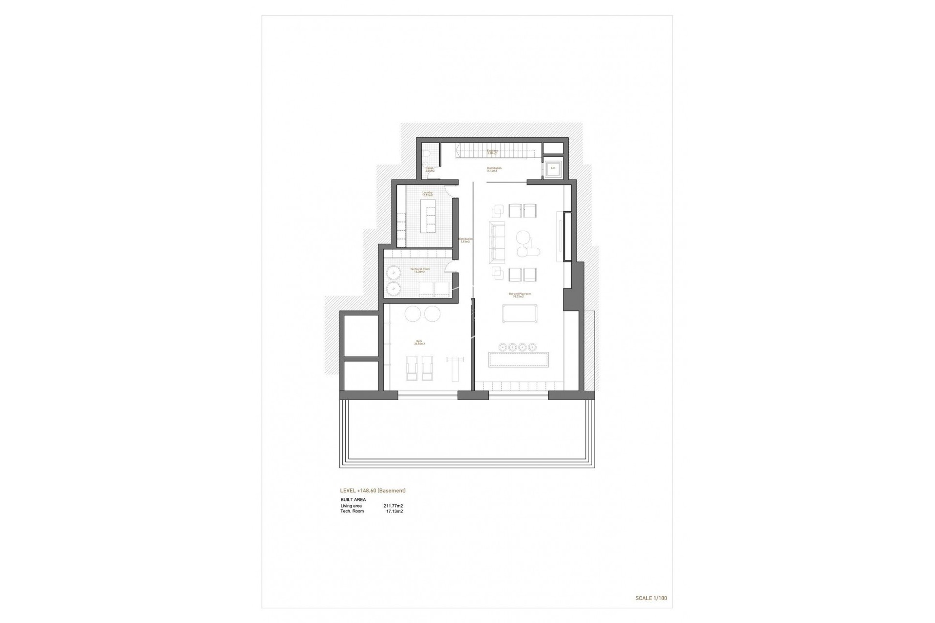 Finally, in the basement, there is a large leisure space, games room, TV and bar and a gym room. Both rooms are flooded by the light that enters through the openings in the swimming pool and through which the light enters, filtered by the brightness of the water.